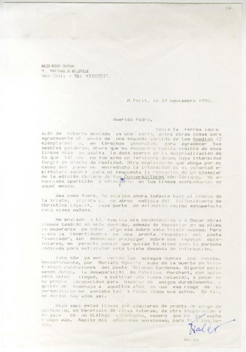 Paris, Francia [a] Pedro Lastra, Nueva York Carta, 17 de noviembre 1990, [manuscrito] Waldo Rojas.