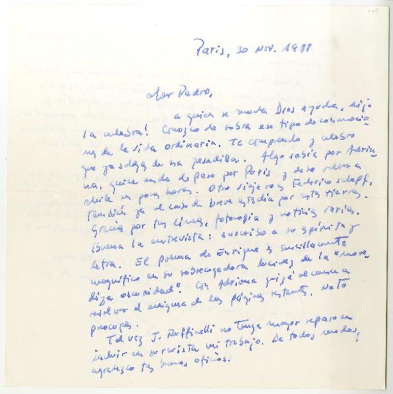 Paris, Francia [a] Pedro Lastra, Nueva York Carta, 30 de noviembre 1988, [manuscrito] Waldo Rojas.