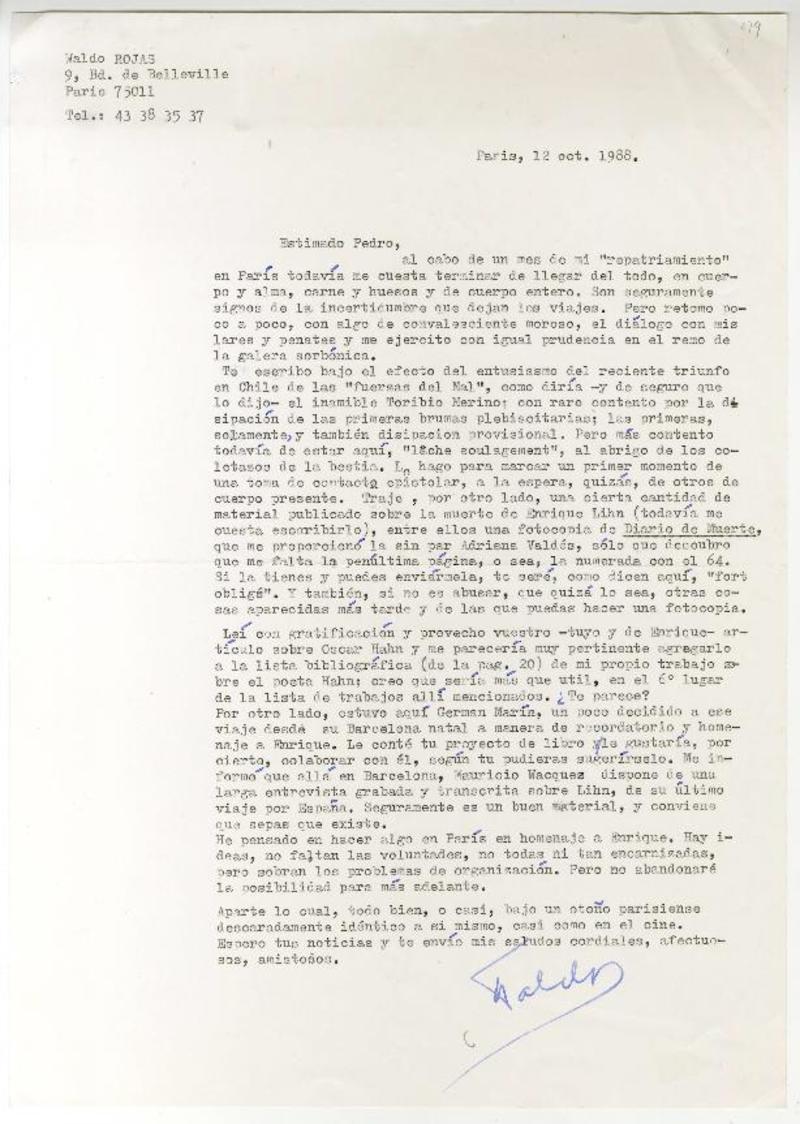 Paris, Francia [a] Pedro Lastra, Nueva York Carta, 12 de octubre 1988, [manuscrito] Waldo Rojas.