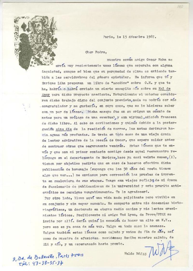 Paris, Francia [a] Pedro Lastra, Nueva York Carta, 15 de diciembre 1987, [manuscrito] Waldo Rojas.