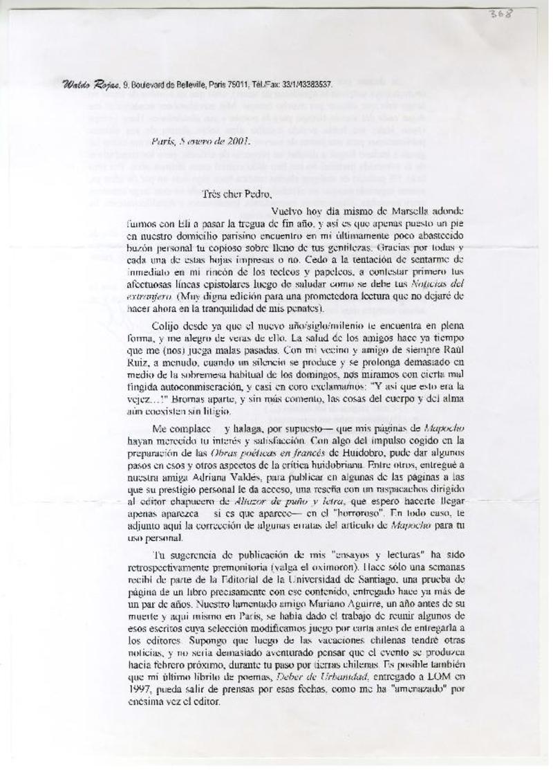 París, Francia [a] Pedro Lastra Carta, 5 de enero 2001, [manuscrito] Waldo Rojas.
