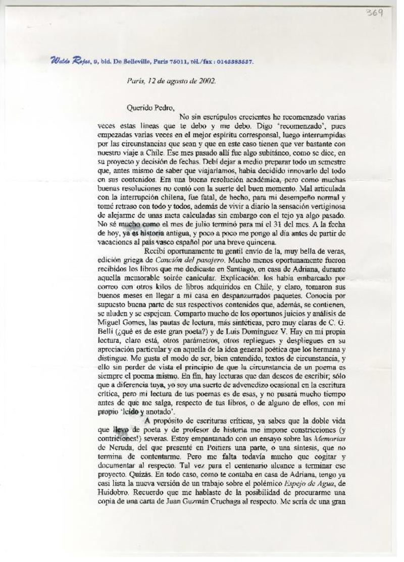 París, Francia [a] Pedro Lastra Carta, 12 de agosto 2002, [manuscrito] Waldo Rojas.