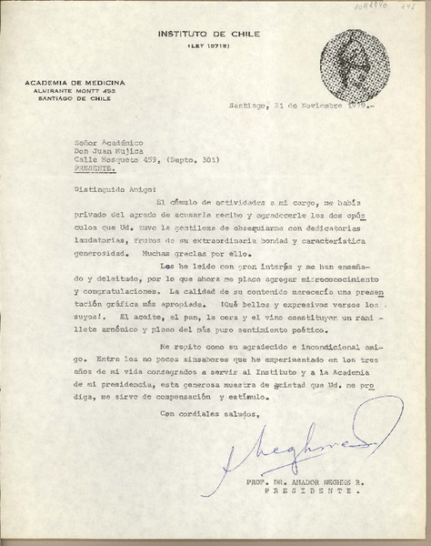 [Carta] 1979 noviembre 21, Santiago, Chile [a] Juan Mujica de la Fuente [manuscrito] Amador Neghme Rodríguez.