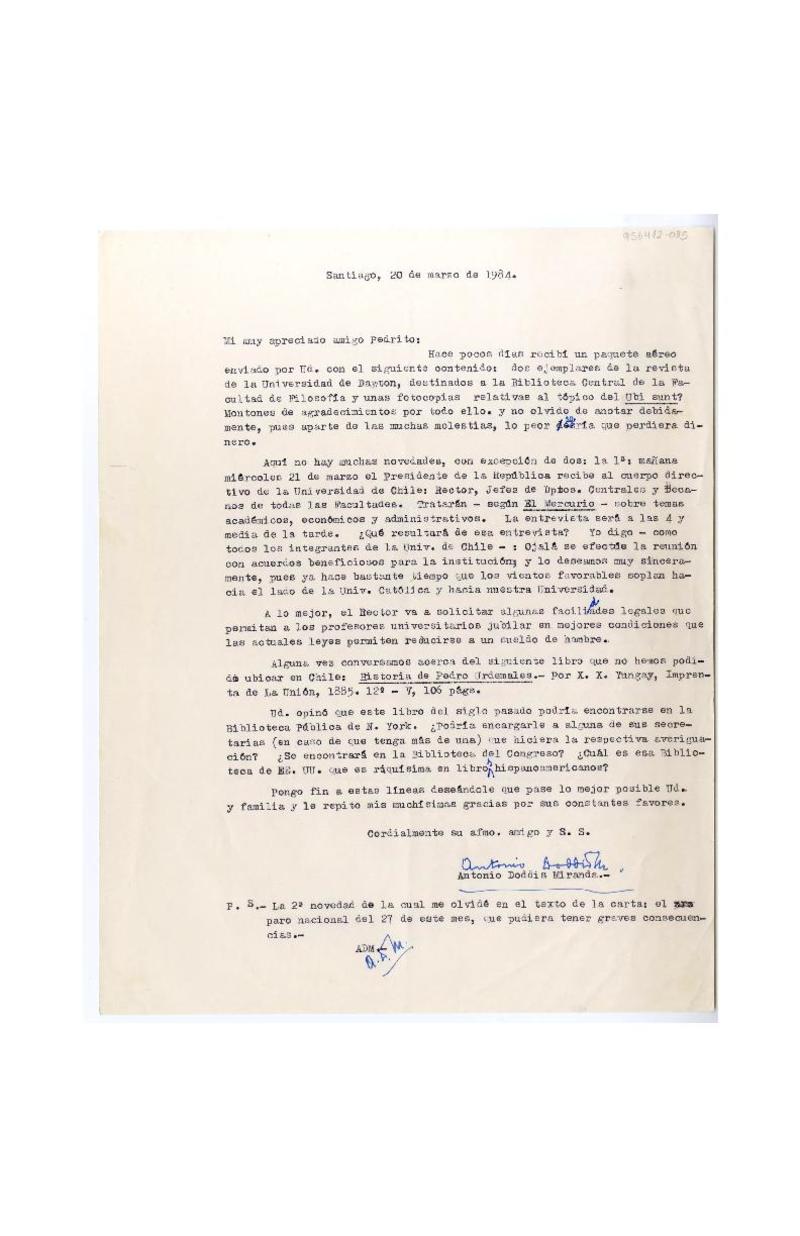 Santiago, Chile [a] Pedro Lastra Carta, 20 de marzo de 1984, [manuscrito] Antonio Doddis.