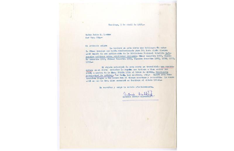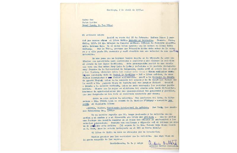 Santiago, Chile [a] Pedro Lastra Carta, 2 de abril de 1978, [manuscrito] Antonio Doddis.
