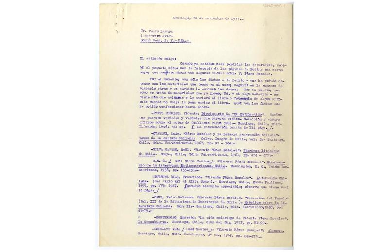 Santiago, Chile [a] Pedro Lastra Carta, 28 de noviembre de 1977, [manuscrito] Antonio Doddis.
