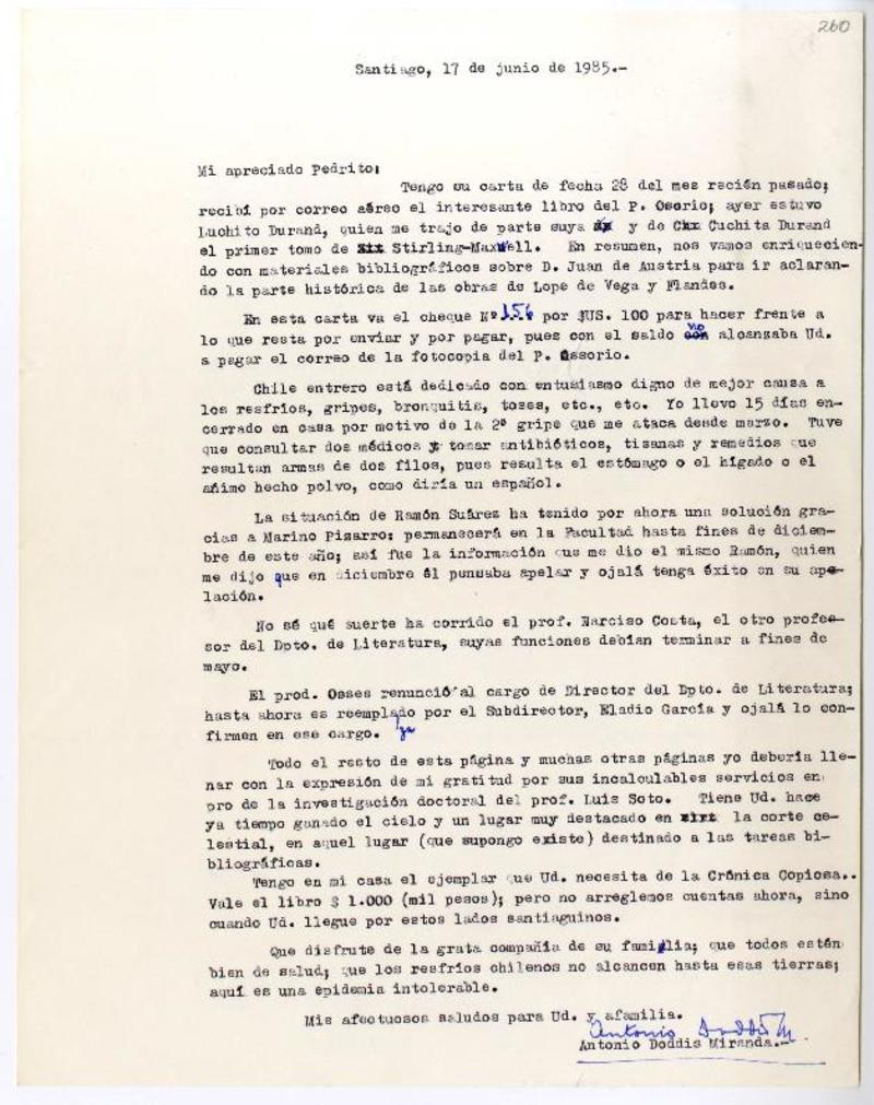 Santiago, Chile [a] Pedro Lastra Carta, 17 de junio 1985, [manuscrito] Antonio Doddis.
