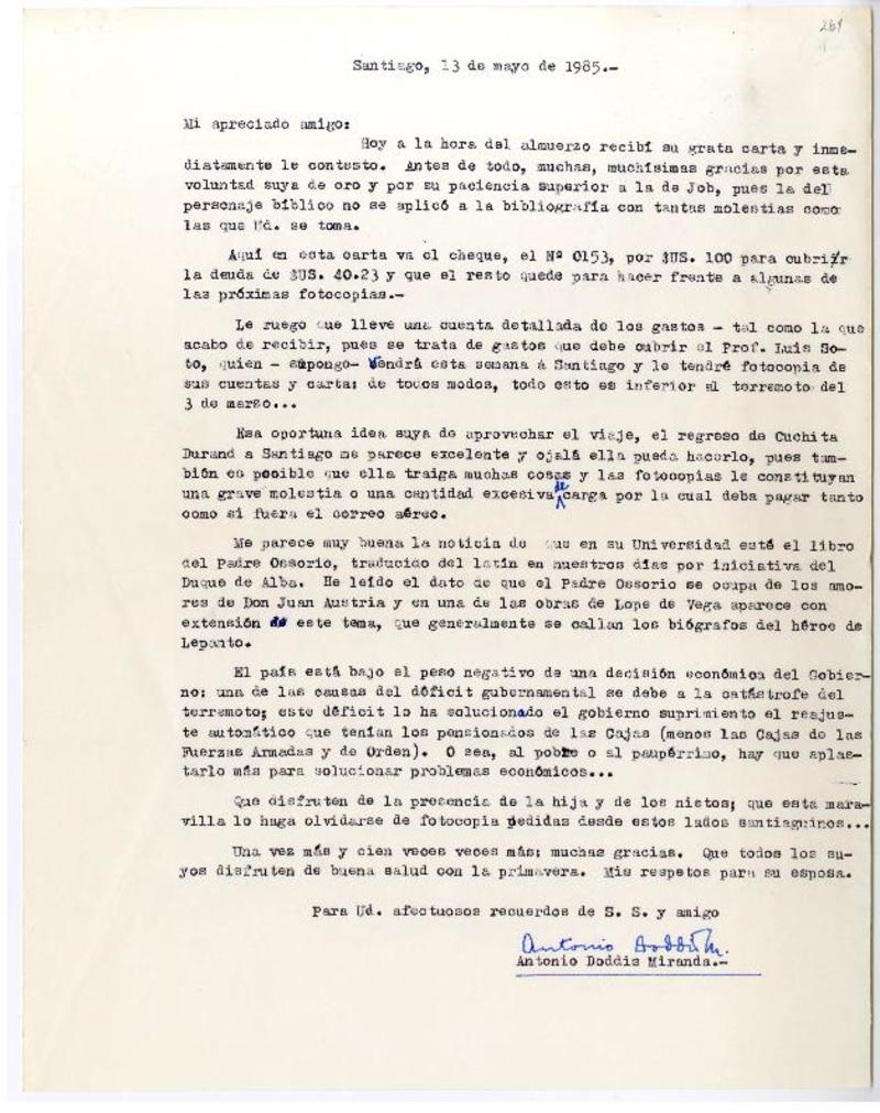 Santiago, Chile [a] Pedro Lastra Carta, 13 de mayo 1985, [manuscrito] Antonio Doddis.
