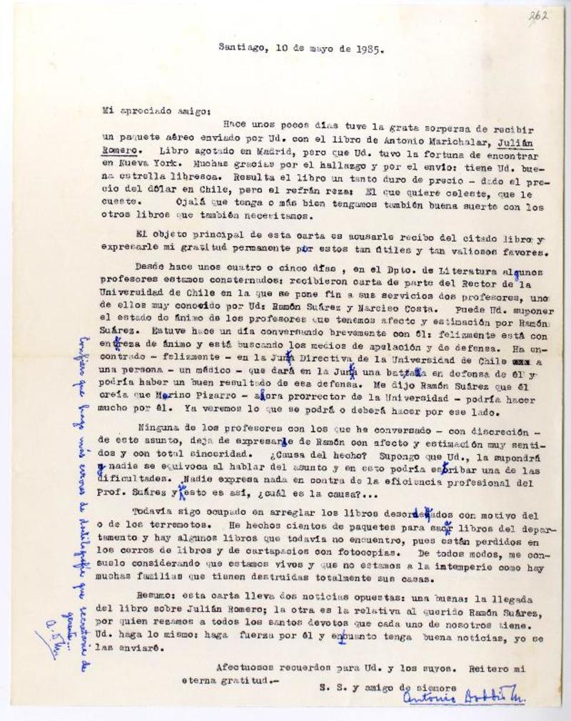 Santiago, Chile [a] Pedro Lastra Carta, 10 de mayo 1985, [manuscrito] Antonio Doddis.