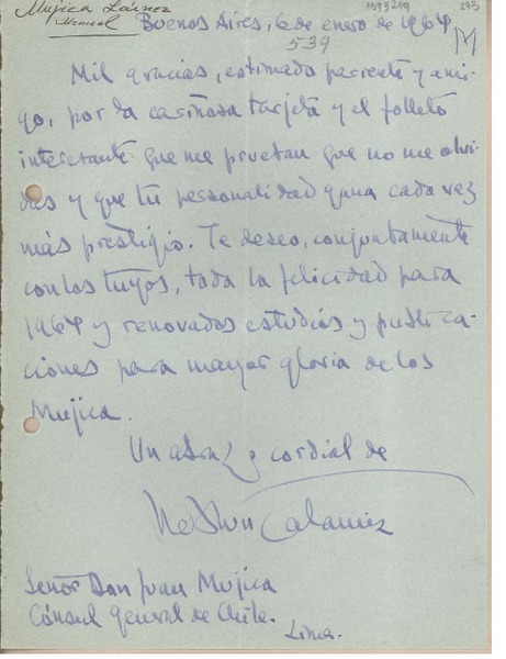 [Carta] 1964 enero 6, Buenos Aires, Argentina [a] Juan mujica, Lima, Perú [manuscrito] Manuel Mujica Láinez.