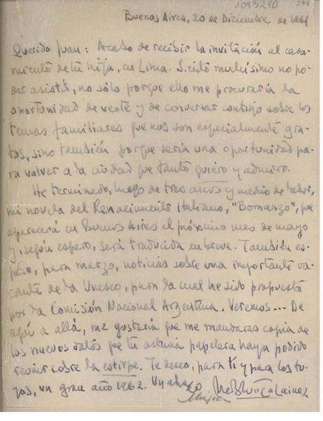 [Carta] 1961 diciembre 20, Buenos Aires, Argentina [a] Juan Mujica, Arequipa, Perú [manuscrito] Manuel Mujica Láinez.