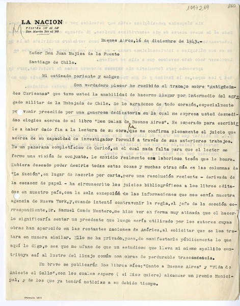[Carta] 1943 diciembre 16, Buenos Aires, Argentina [a] Juan Mujica de la Fuente, Santiago, Chile [manuscrito] Manuel Mujica Laínez.