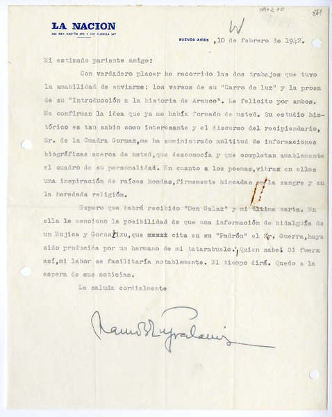 [Carta] 1942 febrero 10, Buenos Aires, Argentina [a] Juan Mujica de la Fuente [manuscrito] Manuel Mujica Laínez.