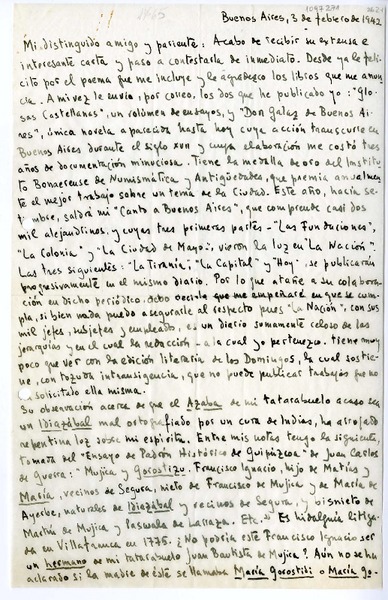 [Carta] 1942 febrer0 3, Buenos Aires, Argentina [a] Juan Mujica de la Fuente [manuscrito] Manuel Mujica Laínez.