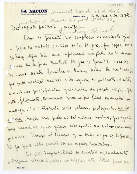 [Carta] 1942 enero 13, Buenos Aires, Argentina [a] Juan Mujica de la Fuente [manuscrito] Manuel Mujica Laínez.
