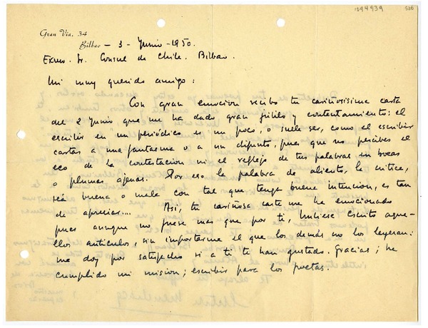 [Carta] 1950 junio 3, Bilbao, España [a] Juan Mujica de la Fuente [manuscrito] Antonio Menchaca Careaga.