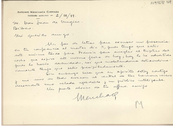 [Carta] 1951 febrero 12, Negury, Vizcaya, España [a] Juan Mujica de la Fuente, Bilbao [manuscrito] Antonio Menchaca Careaga.