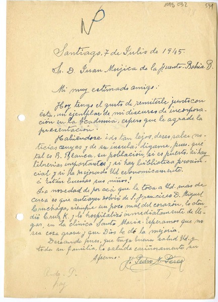 [Carta] 1945 julio 7, Santiago, Chile [a] Juan Mujica de la Fuente, Bahía Blanca, Argentina [manuscrito] Pedro Nolasco Pérez.