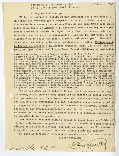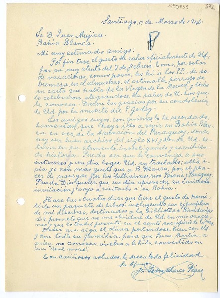 [Carta] 1946 marzo 1, Santiago, Chile [a] Juan Mujica de la Fuente, Bahía Blanca, Argentina [manuscrito] Pedro Nolasco Pérez.
