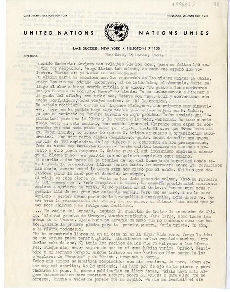 [Carta] 1948 marzo 17, Nueva York [a] Humberto Díaz-Casanueva [manuscrito] Rosamel del Valle.