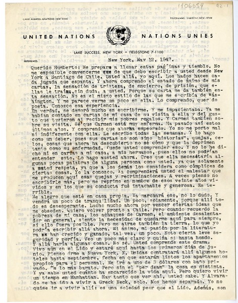 [Carta] 1947 mayo 12, Nueva York [a] Humberto Díaz-Casanueva [manuscrito] Rosamel del Valle.