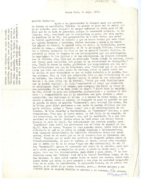 [Carta] 1957 septiembre 11, Nueva York [a] Humberto Díaz-Casanueva [manuscrito] Rosamel del Valle.