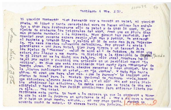 [Carta] 1939 noviembre 4, Santiago, Chile [a] Humberto Díaz-Casanueva [manuscrito] Rosamel del Valle.