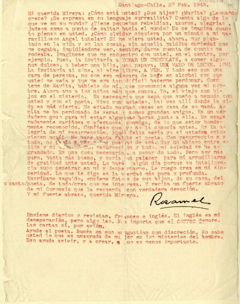 [Carta] 1943 febrero 27, Santiago, Chile [a Mireya] [manuscrito] Rosamel del Valle.