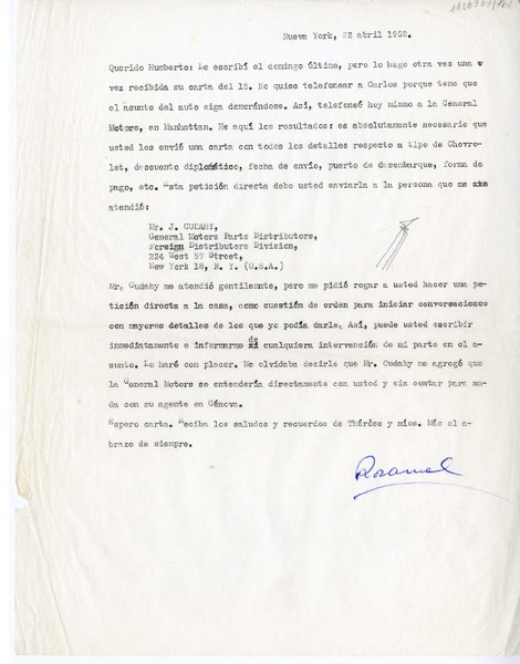 [Carta] 1952 abril 22, Nueva York, [a] Humberto Díaz-Casanueva, [Italia] [manuscrito] Rosamel del Valle.