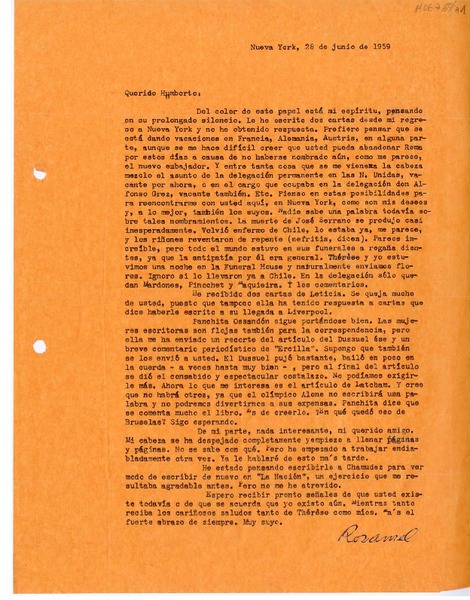 [Carta] 1959 junio 28, Nueva York, [a] Humberto Díaz-Casanueva, [Italia] [manuscrito] Rosamel del Valle.