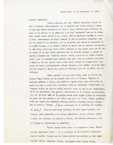 [Carta] 1959 diciembre 10, Nueva York, [a] Humberto Díaz-Casanueva, [Roma, Italia] [manuscrito] Rosamel del Valle.