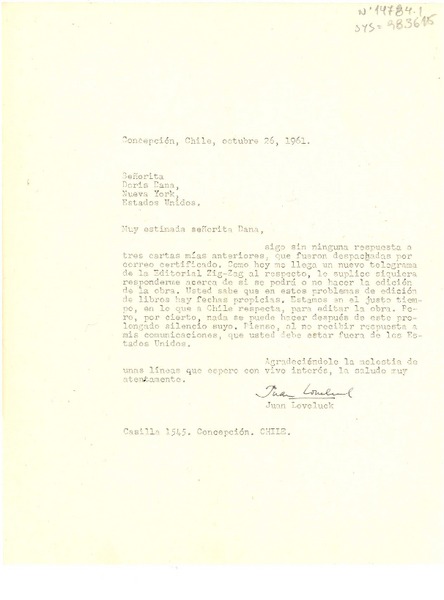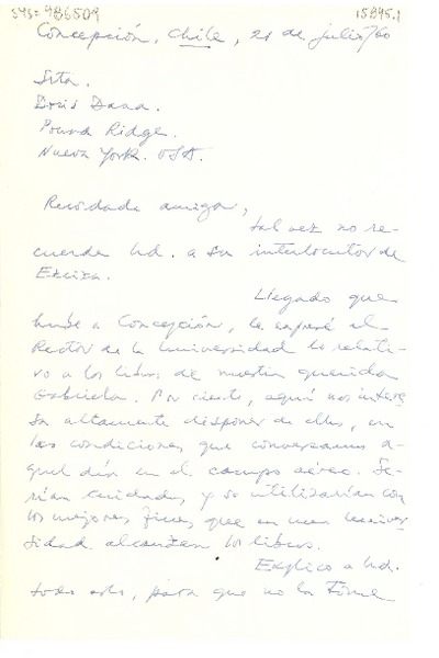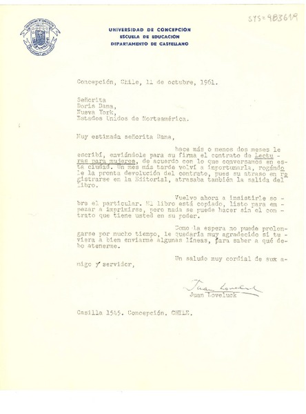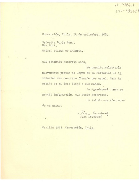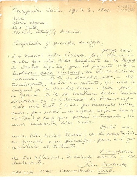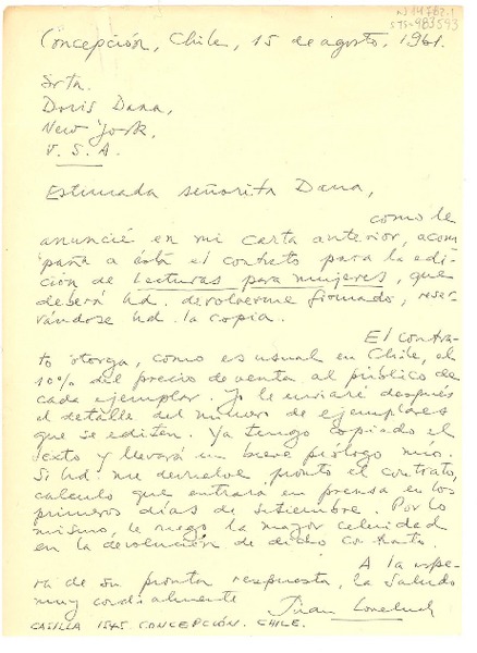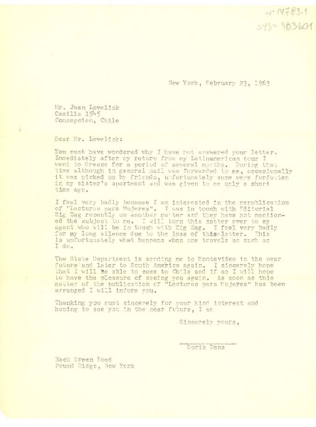 [Carta] 1963 feb. 23, New York, U.S.A. [a] Juan Loveluck, Concepción, Chile [manuscrito] Doris Dana.