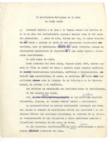 El sentimiento religioso en la obra de Rubén Darío [manuscrito] Hernán Díaz Arrieta.