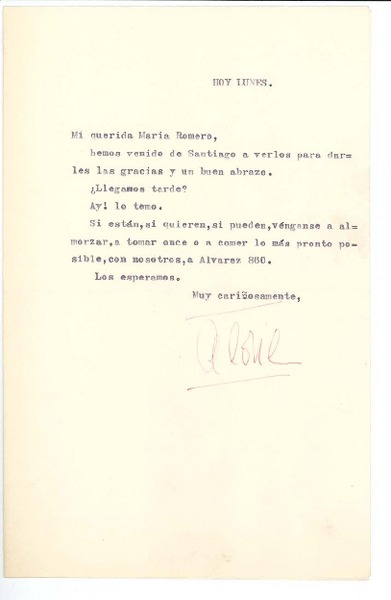 [Carta] c.1960, Santiago, Chile [a] María Romero [manuscrito] Hernán Díaz Arrieta.