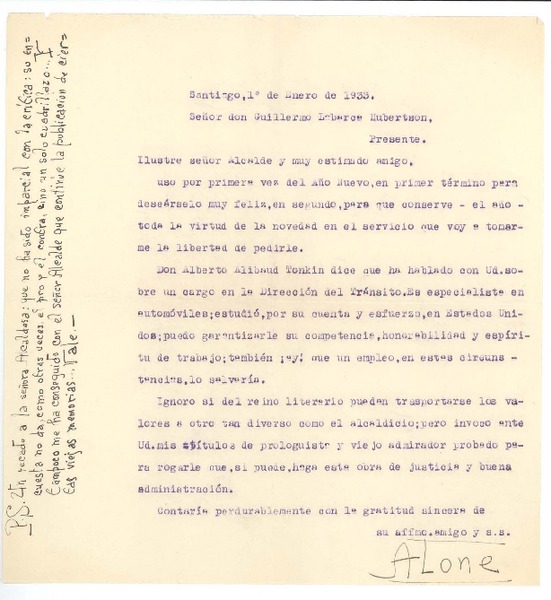 [Carta] 1933 ene. 1, Santiago, Chile [a] Guillermo Labarca Hubertson [manuscrito] Hernán Díaz Arrieta.