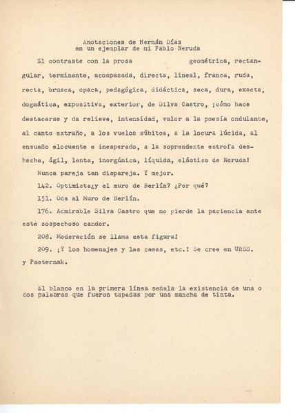 [Anotaciones] [manuscrito] Hernán Díaz Arrieta; transcripción de Raúl Silva Castro.