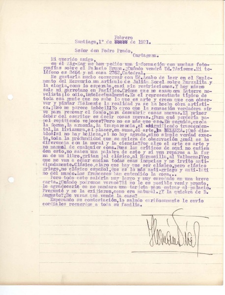 [Carta] 1921 feb. 1, Santiago, Chile [a] Pedro Prado [manuscrito] Hernán Díaz Arrieta.