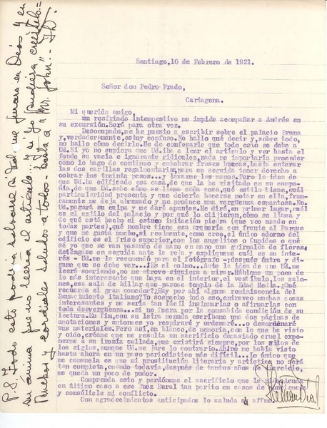 [Carta] 1921 feb. 10, Santiago, Chile [a] Pedro Prado [manuscrito] Hernán Díaz Arrieta.