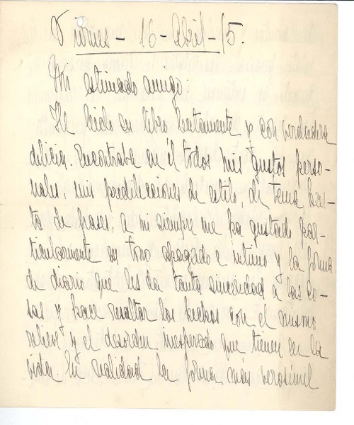 [Carta] 1915 abr. 16, Santiago, Chile [a] Pedro Prado [manuscrito] Hernán Díaz Arrieta.