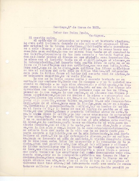 [Carta] 1921 mar. 1, Santiago, Chile [a] Pedro Prado [manuscrito] Hernán Díaz Arrieta.