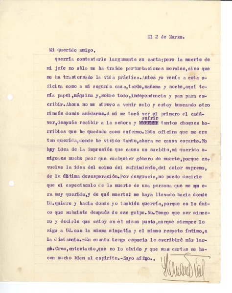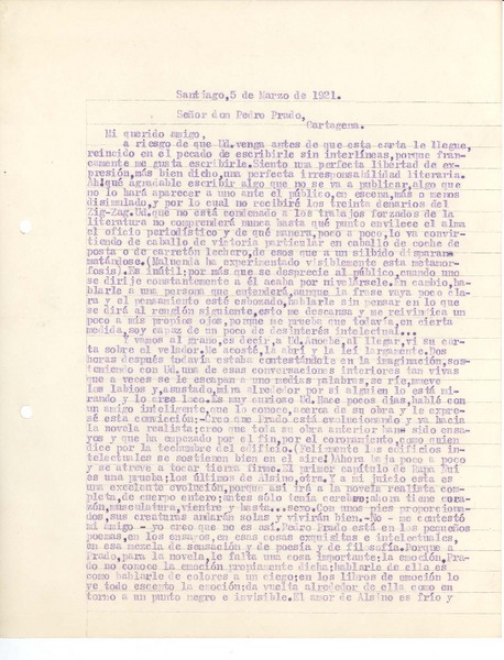 [Carta] 1921 mar. 5, Santiago, Chile [a] Pedro Prado [manuscrito] Hernán Díaz Arrieta.