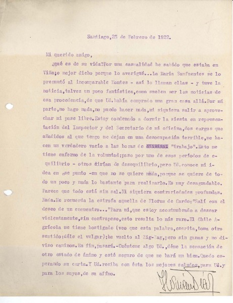 [Carta] 1922 feb. 25, Santiago, Chile [a] Pedro Prado [manuscrito] Hernán Díaz Arrieta.