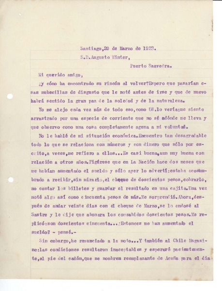 [Carta] 1923 mar. 20, Santiago, Chile [a] Augusto Winter [manuscrito] Hernán Díaz Arrieta.