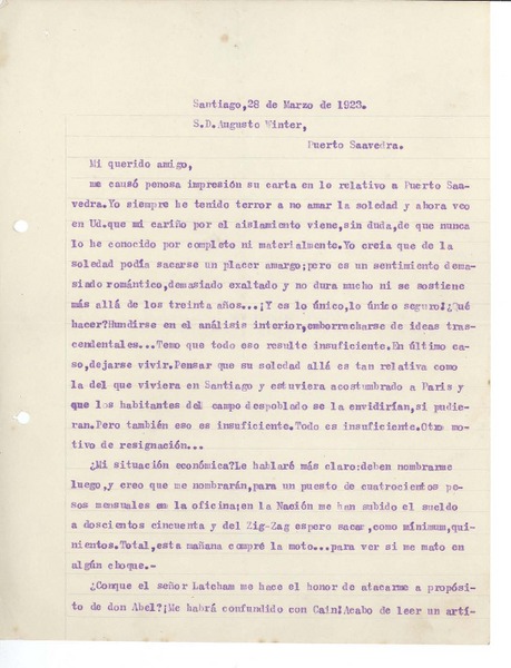 [Carta] 1923 mar. 28, Santiago, Chile [a] Augusto Winter [manuscrito] Hernán Díaz Arrieta.