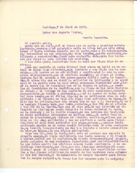 [Carta] 1923 abr. 7, Santiago, Chile [a] Augusto Winter [manuscrito] Hernán Díaz Arrieta.