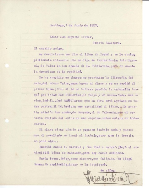 [Carta] 1923 jun. 7, Santiago, Chile [a] Augusto Winter [manuscrito] Hernán Díaz Arrieta.