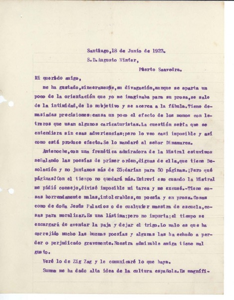 [Carta] 1923 jun. 18, Santiago, Chile [a] Augusto Winter [manuscrito] Hernán Díaz Arrieta.