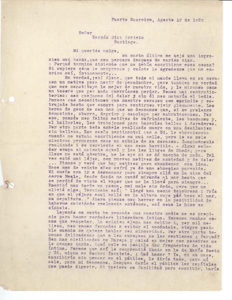 [Carta] 1923 ago. 19, Santiago, Chile [a] Hernán Díaz Arrieta [manuscrito] Augusto Winter.