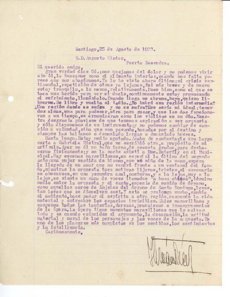 [Carta] 1923 ago. 25 Santiago, Chile [a] Augusto Winter [manuscrito] Hernán Díaz Arrieta.