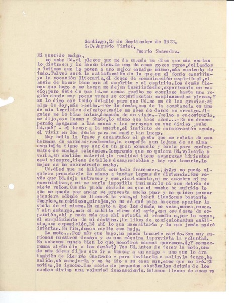 [Carta] 1923 sep. 29, Santiago, Chile [a] Augusto Winter [manuscrito] Hernán Díaz Arrieta.